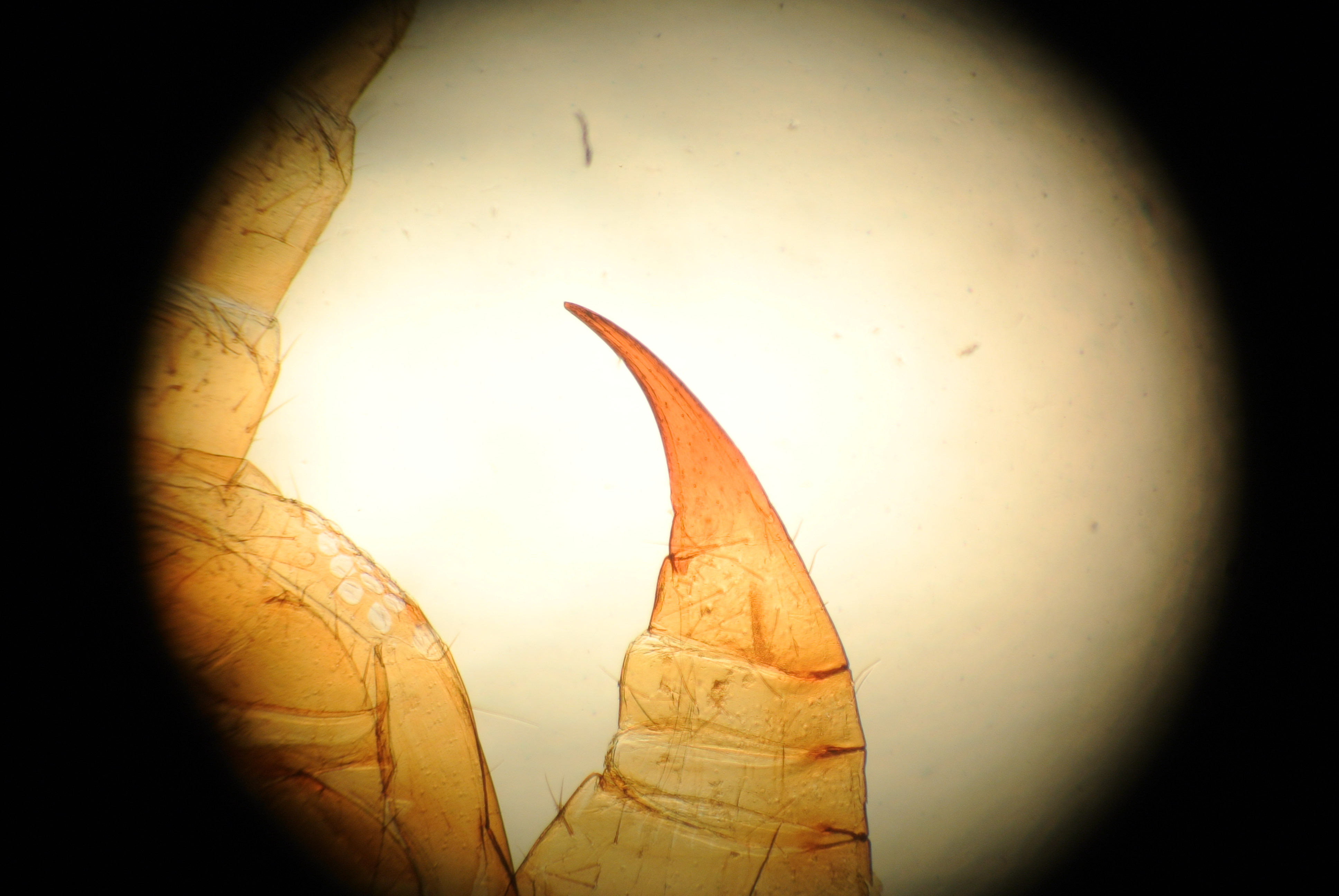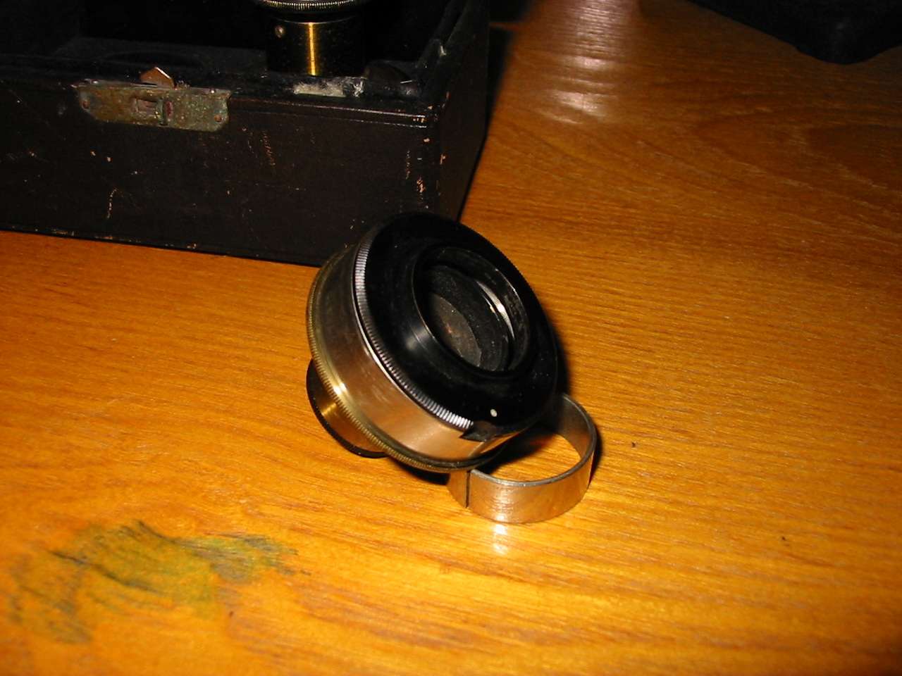 Each objective is of 215mm tube length construction and is corrected for use without any cover glass. One is a low power finder (5x) and the other a higher power (40x). One will quickly notice that neither is of the power one expects to find on a student microscope; 10x and 43x being the usual combination. The reason for this quickly becomes apparent when one calculates powers in consideration of the characteristics of the stand. A 215mm tube length, correction for no cover glass and the nessecity of a short working distance. At right one may see the working distance of the 40x objective.