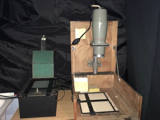 Resolved to get something much more like an acceptable print from the contact printer I adjusted the position of the internal wire and repeated the three second exposure with the night light bulbs and a different negative. This time I worked in my improvised darkroom and processed using Dektol and Kodafix in an open tray. I used a plain water stop in a third larger tray. Trying to be too clever for my own good in my first attempt at tray processing I sought to overcome the effect of the off center bulbs in my contact printer. I used roughly a minute and a half of total processing time and for nearly a third of that I held the side that corresponded with the bulbs out of the tray using my tongs and preferentially developed the opposite side of the print. The results as seen at left aren’t more even as a result, if anything they’re less. Rather than being more even the one side is significantly less developed overall and there’s somewhat less overall contrast. With little experience on the matter I’ll tentatively attribute this to the far lower rate of agitation I was able to achieve in the trays as compared to the constant agitation in the rotating print drum.