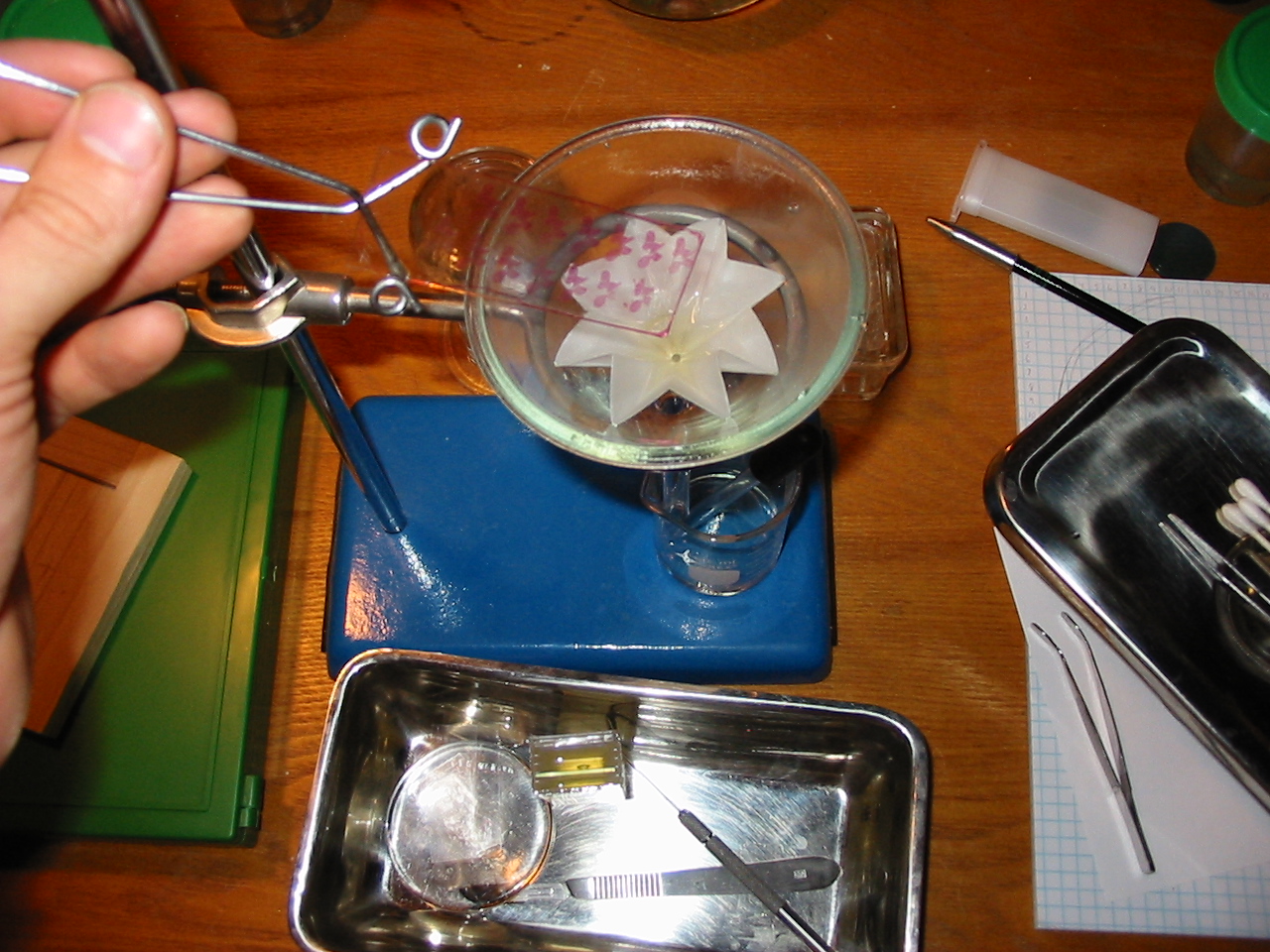 Using a fine camels hair brush one must apply adhesive either to the surface on which the specimen will be mounted or onto the underside of the specimen itself. For some adhesives a needle in a holder or hemostat will serve. Some adhesives are more forgiving than others as regards positioning, but at all costs one must avoid allowing any adhesive adhere to an observable surface. One should be aware that some adhesives dry opaque or with a gloss finish that will show conspicuously in the finished mount. For the smallest objects one may paint the entire surface with gum and allow it dry. When an object is placed one need only direct a breath of moist air onto the whole to render the gum adhesive.