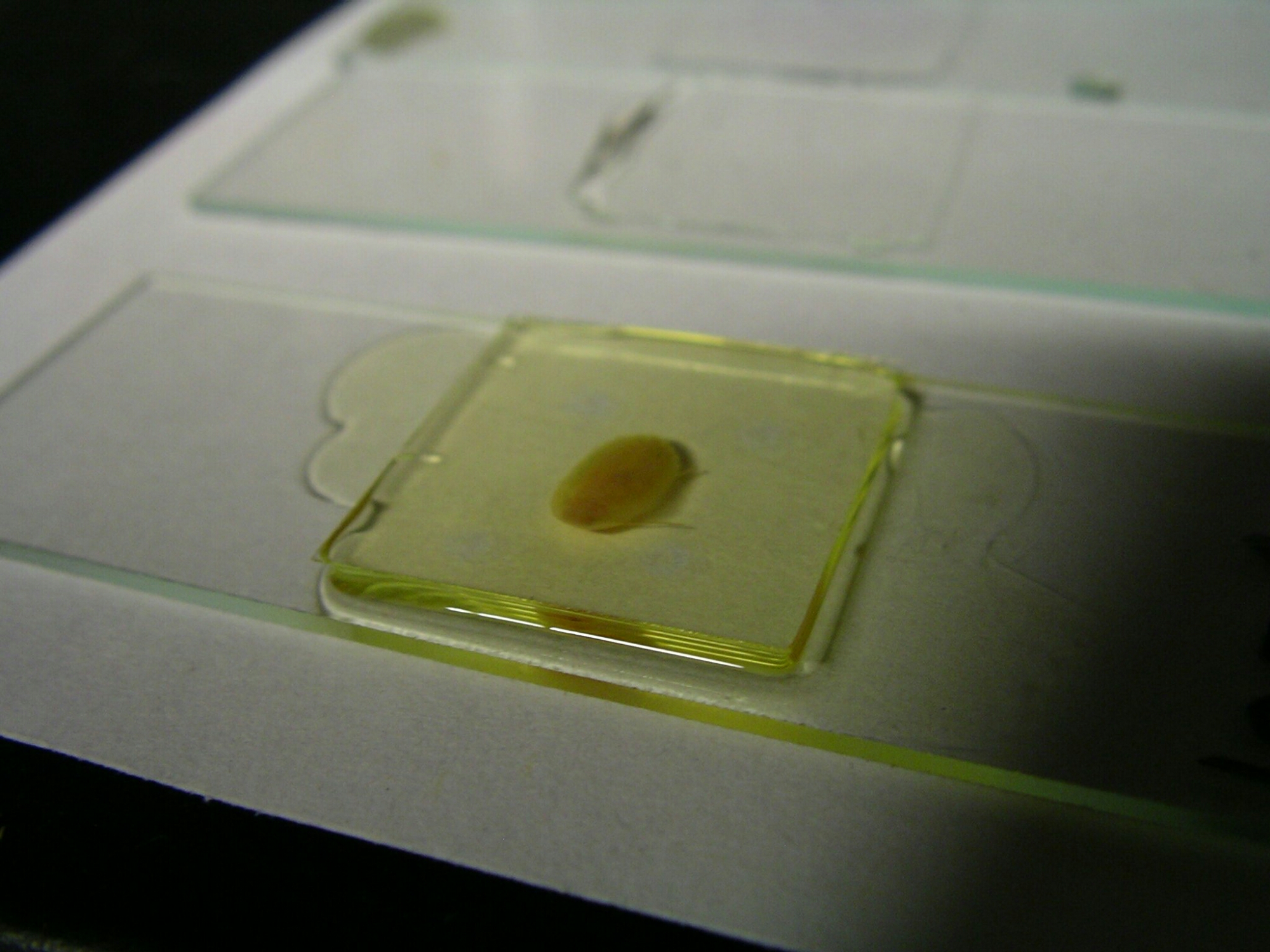 Some texts recommend heating the slip so that the shellac cell is rendered soft and then applying gentle pressure to the cover to form a seal. This method has the advantage of eliminating imperfect seals which result from imperfections in the top surface of the cell. Regrettably, this method may also tend to deform the cell if the slip is heated too much or for too long. One may achieve as effective a seal by painting a ring of fresh shellac on the cell before placing the cover glass. Once the cover glass is in place set a ring of shellac around the margins of the cover to ensure that the seal is hermetic. A few layers of shellac are recommended so that the cover is well secured mechanically.