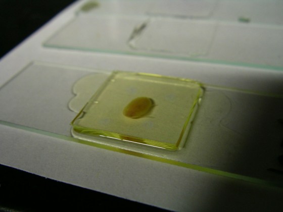 Prior to sealing a cell mount one must be confident that the humidity of the specimen is lower than the humidity of any environment in which it is apt to find itself, and that the positioning is as perfect as it might be. Many adhesives will require several hours before the required conditions are met. However, once such is the case the cell should be sealed. Examine the slip under low power to ensure no dust has landed on the objects and all is as it should be.