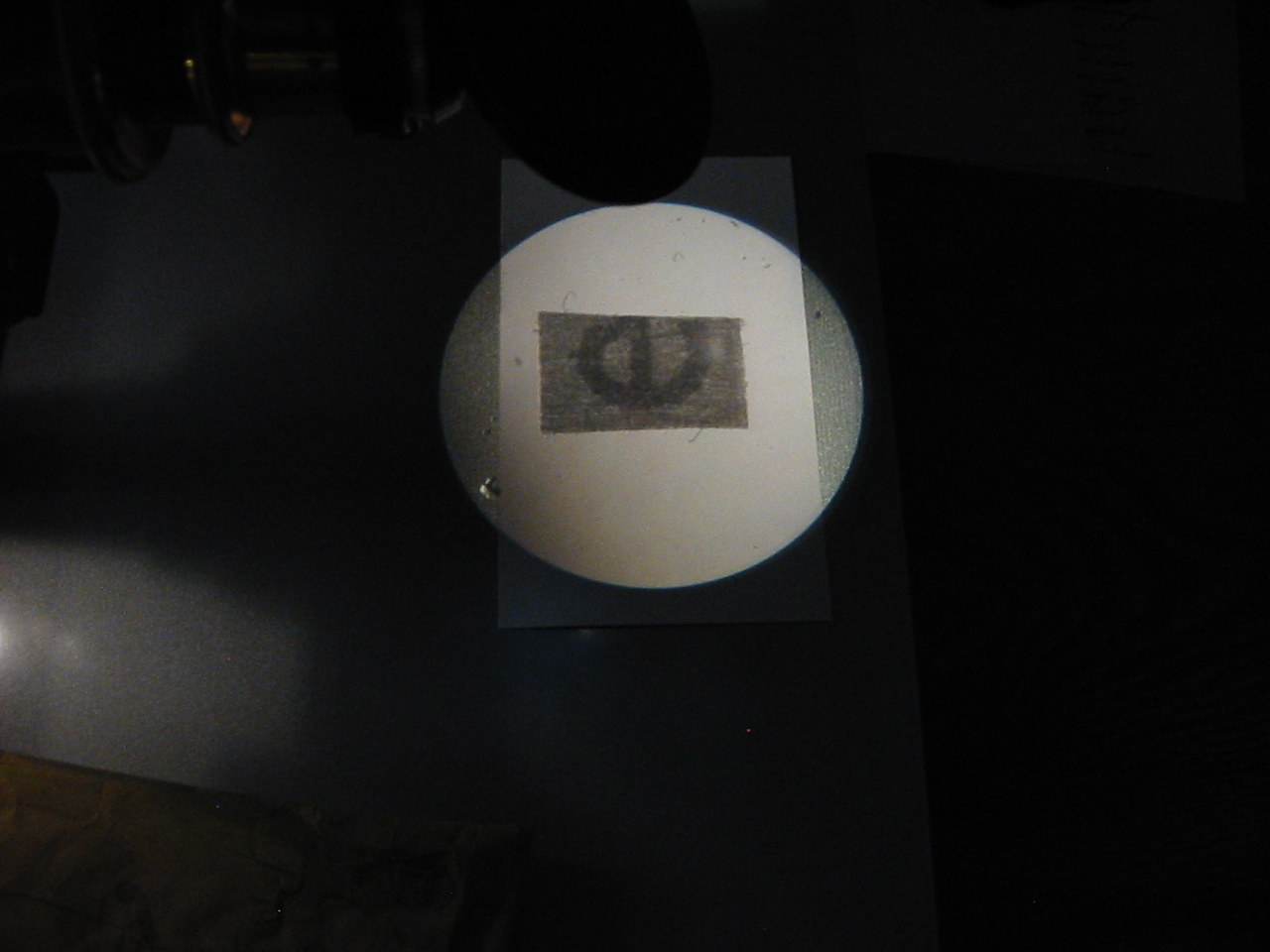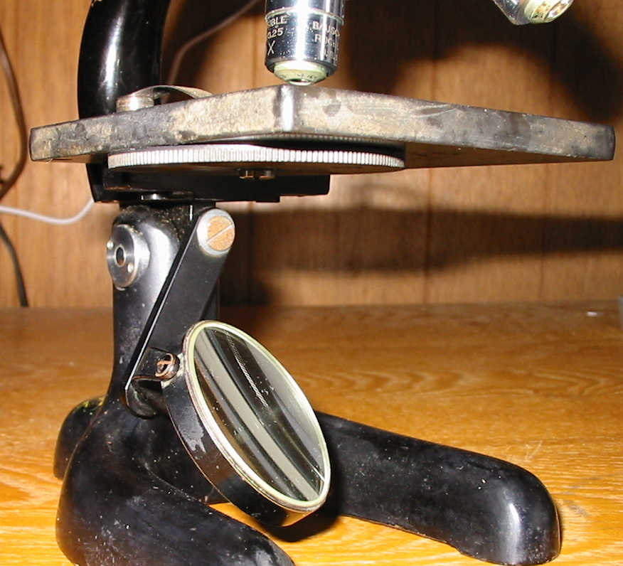 The illuminator was positioned as seen at right. When using a ground glass filter the ground surface of the filter becomes the light source, and it is this surface that must be focused with the condenser for critical illumination. We can use an inexpensive household light bulb, opal bulb, or clear coiled filament bulb without issue. With a clear bulb one can focus on the filament image that shows on the ground glass, without the filament image a focusing assist is essential. The assistance in this case is provided by something I felt people would have on hand; a point cut from the adhesive surface of a Post-it®‡ note. Put it in place for focusing and then remove it or adjust the mirror slightly to bring move it beyond the field of view. Only minor adjustments for alignment, stopping down the iris diaphragm, and re-focusing of the condenser will be required when switching between objectives. Once the illuminators condenser if focused it will not be necessary to re-focus for other objectives provided the distance to the mirror is not changed.