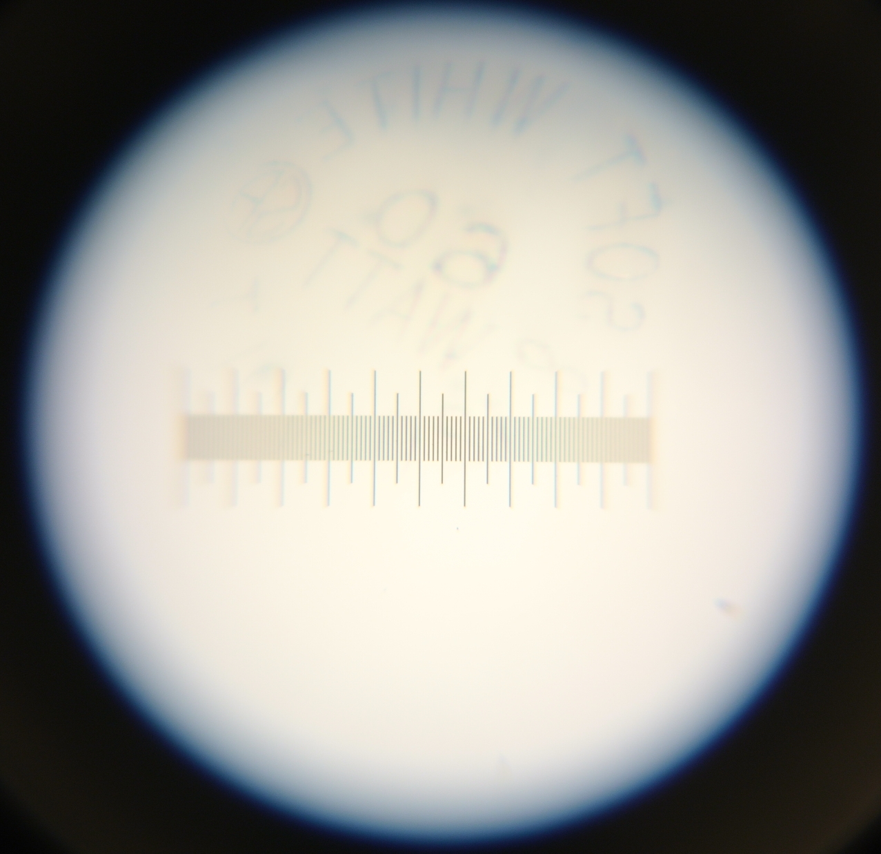 First is an image of the filed of view taken with a 16mm objective and the focusing assist in place as critical illumination is set up. In it one will note the pronounced color fringes on the edges of the focusing assist. The microscope used is equipped with an Abbe substage condenser. Not corrected either for chromatic or spherical aberration, it is the primary source of the fringes seen in the image bellow.