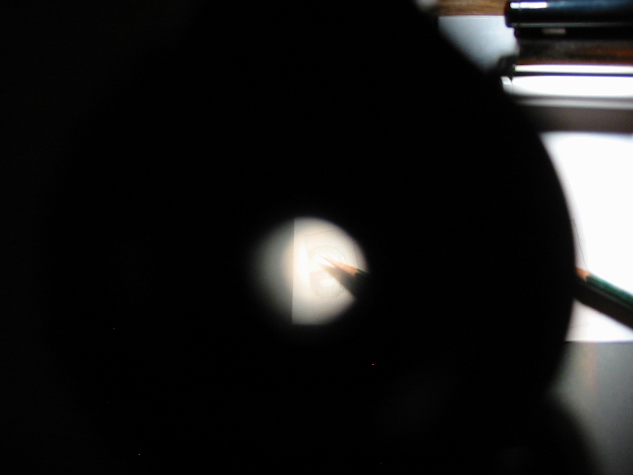 Below is something of the image one sees while looking into the camera lucida. At the right one can see a portion of the pencil while to the left one can see the reflection of that pencil simultaneous to the image of the letter “e” slide. The lighter central portion of the image in the eyepiece is not visible in use but is caused by the borders of the hole in the reflector.