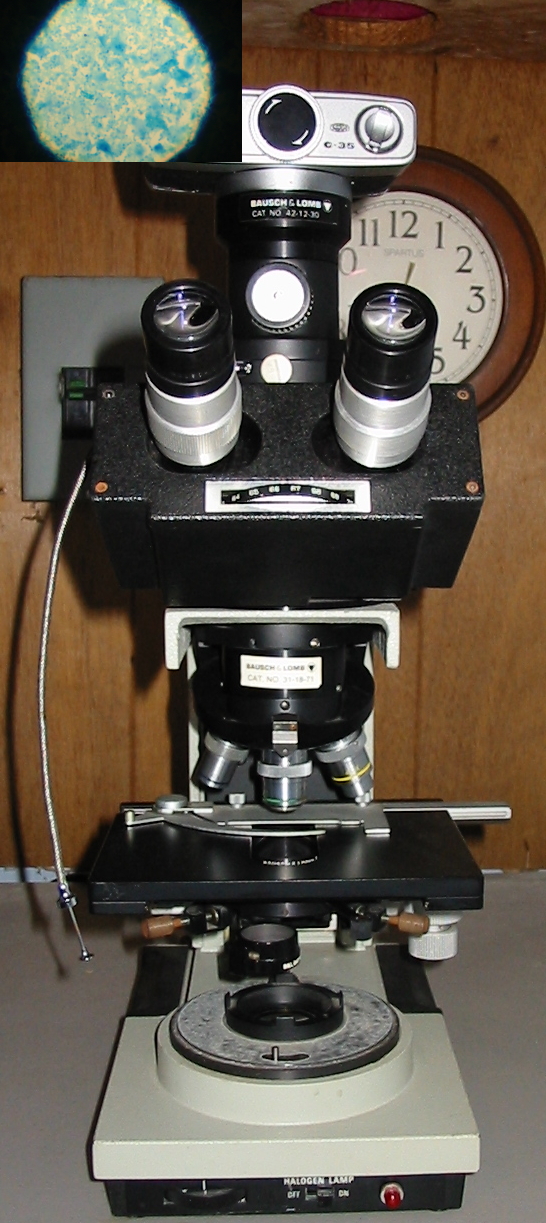 One might have seen projection oculars available and be tempted to believe that any poor results experienced are the fault of the optics. Before spending the money on specialty oculars (which have their uses) one might observe the images below. The first image is that from a regular 12.5x Huygenian by B&L, while the second is a 12.5x projection ocular by B&L. All else being the same, (except for the steadiness of my hand at the camera) one notices immediately that the first ocular produces a sharper, more tightly constrained image. Why then are projection oculars generally more expensive? Without getting into it, lets just say that they have their uses and under particular conditions to which they are suited they more than justify their expense. The demonstration here is to illustrate that one needn’t have a special set of optics to project an image for micrography.