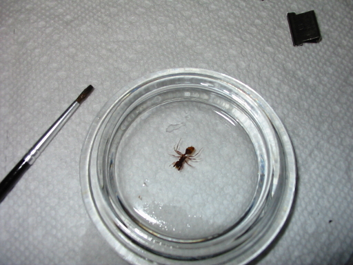 6) Apply pressure to bulbous portions of the specimen with the butt of a camel hair brush or needle holder, working from the head and expressing liquefied internal organs through the anus. For small ants and thin bodied specimens this treatment is not required.